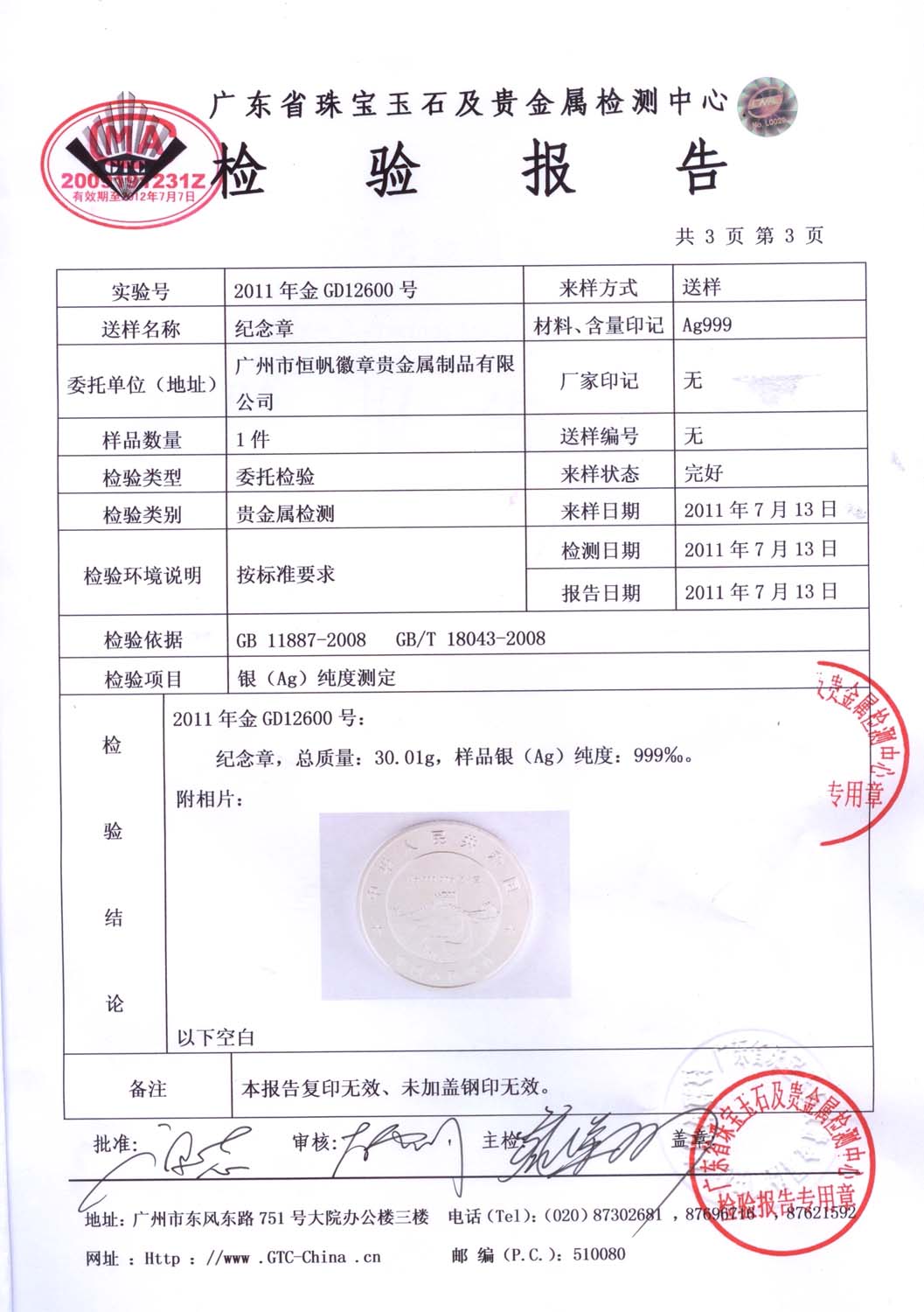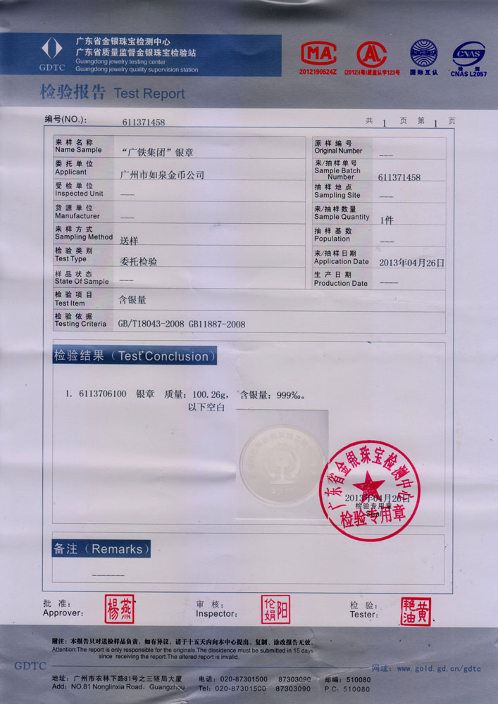 廣東省質監純金銀紀念章鑒定報告