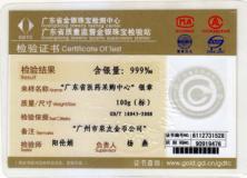 廣東省質監局黃金千足金純金鑒定證書
