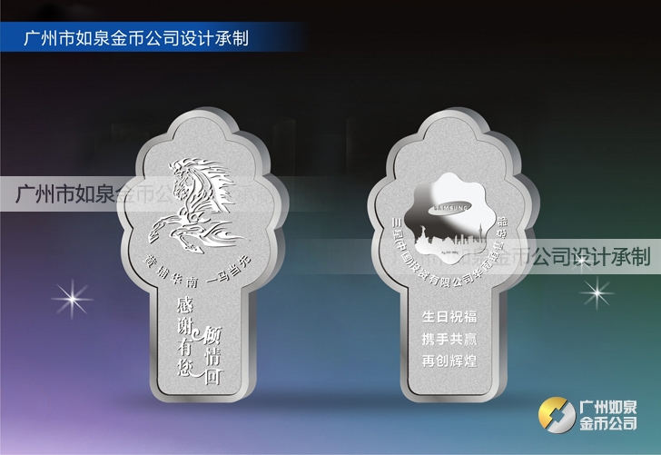 廣州市如泉金幣公司依托上海造幣廠和深圳國寶造幣廠等造幣公司以及金銀制品廠,設(shè)計定做紀念幣、紀念章、金銀幣、金銀章、金銀條,采用造幣工藝、選用千足金銀,個性定制金幣、定做銀幣、訂做金條、訂制銀條、制作紀念銀幣、制造紀念金幣、加工紀念銀章、生產(chǎn)紀念金章,純金純銀鑄造、全部國檢、權(quán)威檢測。