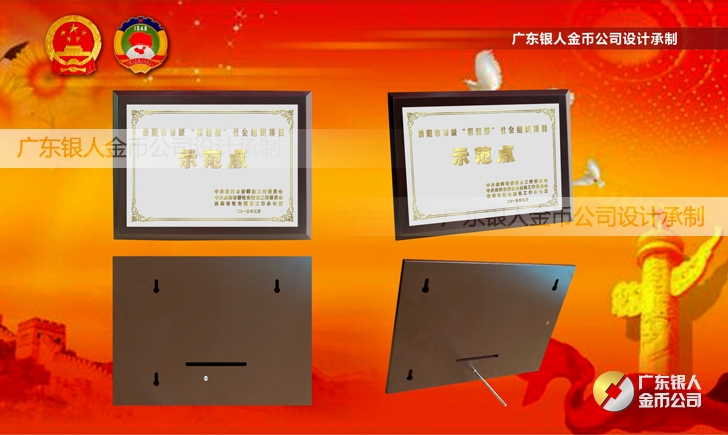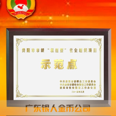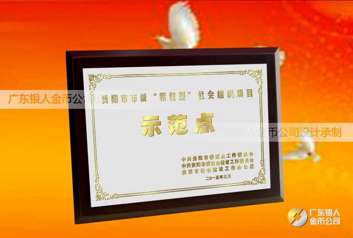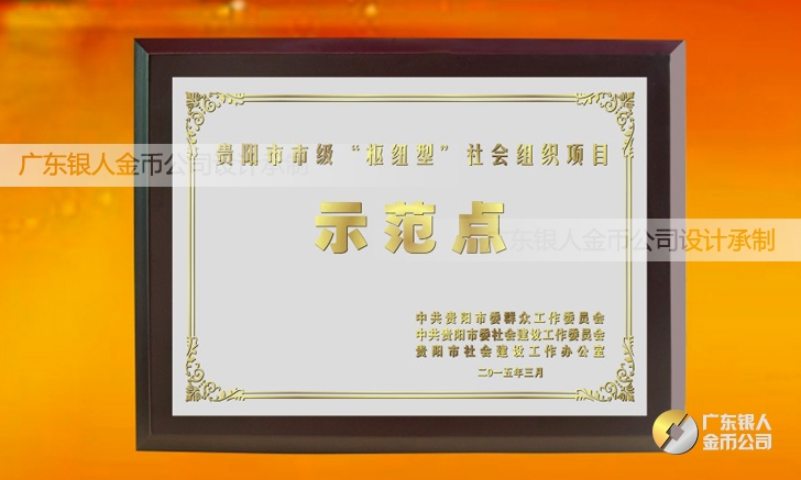 廣東銀人金幣公司設計制作承接中共貴陽市委、民政局、財政局、群工委、中共貴陽市委社會建設工作委員會、貴陽市社會建設工作辦公室表彰樞紐型社會組織項目榮譽獎狀、先進集體獎牌、先進單位獎牌、先進個人牌匾、高檔鈦金獎牌定制。