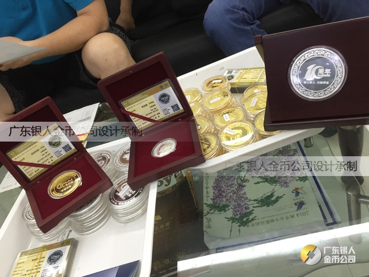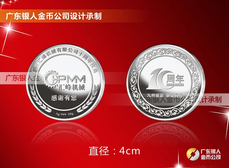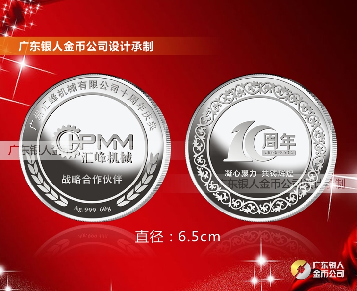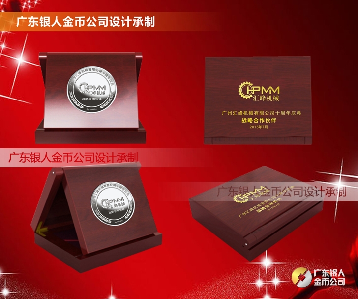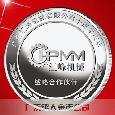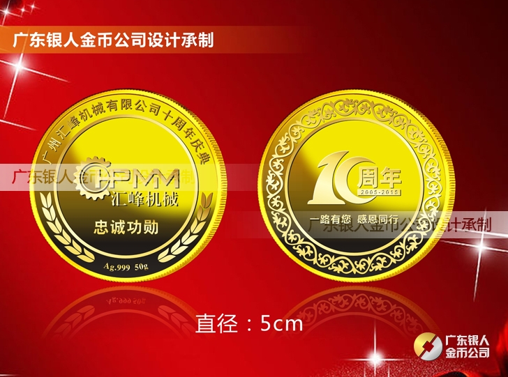 廣州匯峰機械公司成立十周年慶典紀念工作滿3年服務獎純銀紀念銀牌定制、滿5年忠誠獎純金銀獎牌定制、滿10年功勛獎純金銀紀念幣定制。