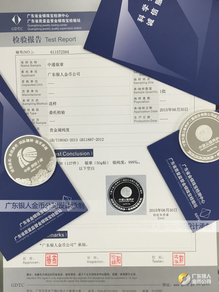 廣東銀人金幣公司承接客戶個性化定制的金銀幣、金銀章、金銀條、金銀牌、金銀盤均由國家質監(jiān)部門、嚴格檢測、權威鑒定: 出具————國家質檢、檢測報告。