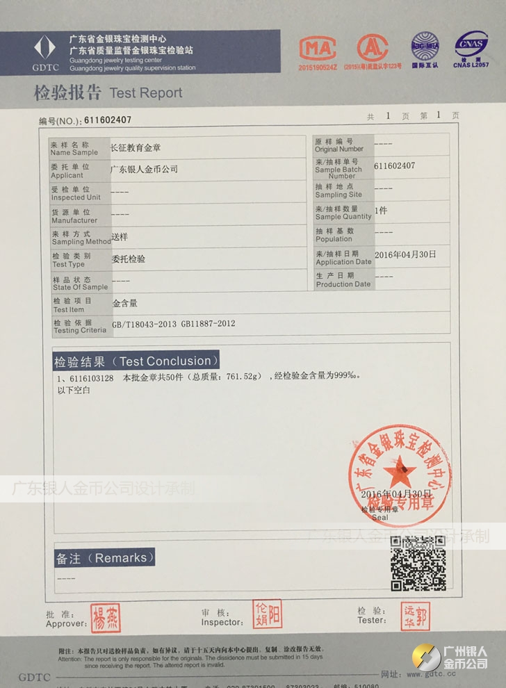 廣東銀人金幣公司承接客戶個性化定制的金銀幣、金銀章、金銀條、金銀牌、金銀盤均由國家質監部門、嚴格檢測、權威鑒定: