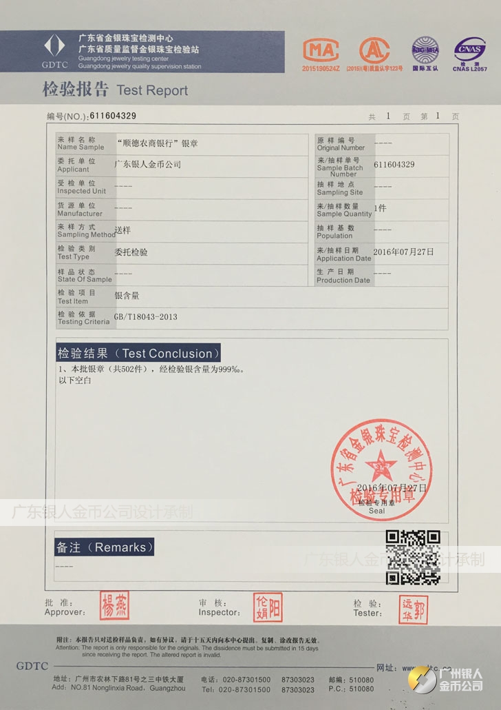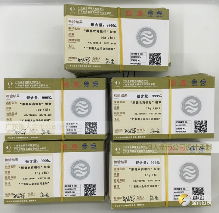 廣東銀人金幣公司承接客戶個性化定制的金銀幣、金銀章、金銀條、金銀牌、金銀盤均由國家質監部門、嚴格檢測、權威鑒定: