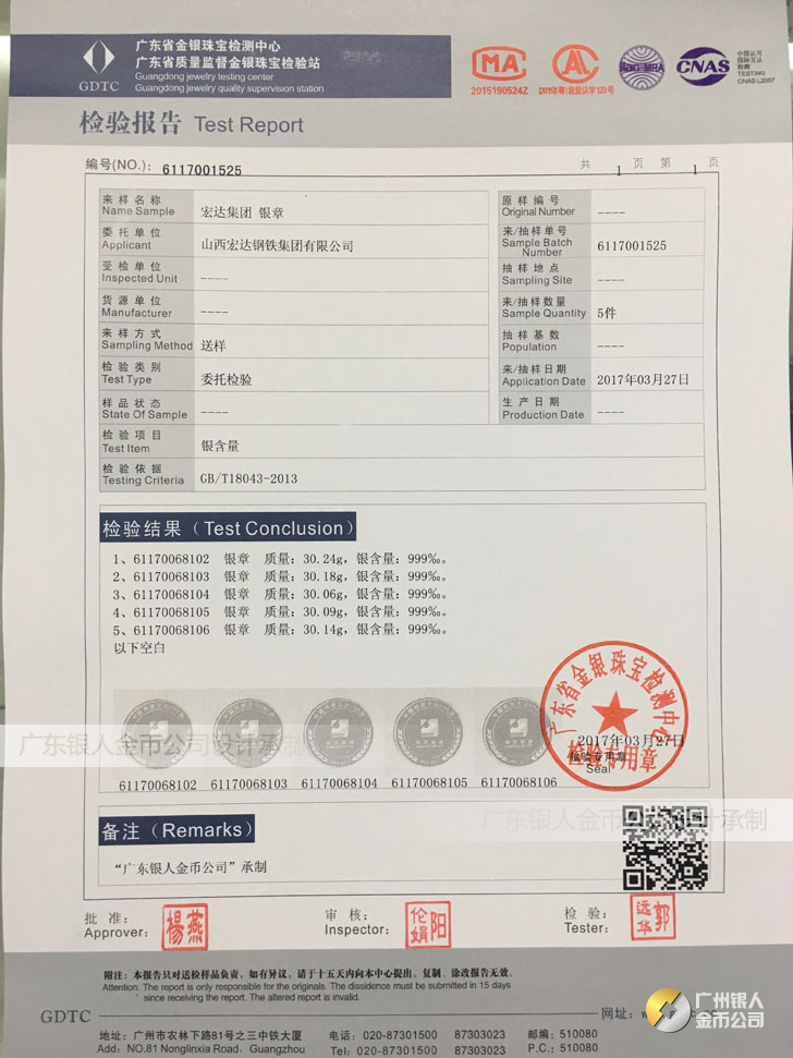廣東銀人金幣公司承接客戶個(gè)性化定制的金銀幣、金銀章、金銀條、金銀牌、金銀盤均由國(guó)家質(zhì)監(jiān)部門、嚴(yán)格檢測(cè)、權(quán)威鑒定: