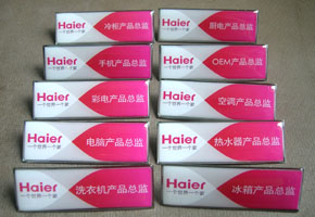 海爾集團(tuán)——為集團(tuán)公司制作員工佩戴的員工胸卡、有機(jī)玻璃胸卡、以及工作人員使用的水晶工作牌、銷售賣場(chǎng)營(yíng)業(yè)員胸牌、導(dǎo)購(gòu)員水晶胸牌。