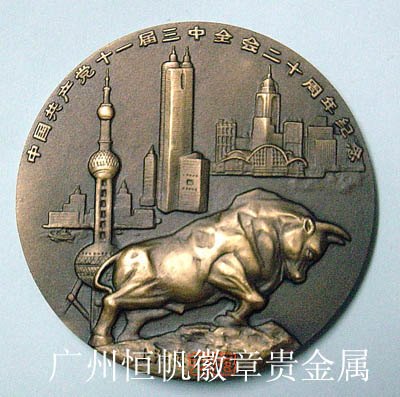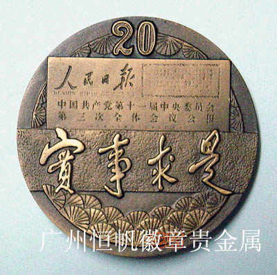 紀(jì)念章為銅質(zhì)(古銅色),圓形,直徑60毫米.正圖為《人民日?qǐng)?bào)》發(fā)表十一屆三中全會(huì)公報(bào)的題頭及鄧小平題寫的“實(shí)事求是”手跡。周圍飾以松枝,上部“20”表示二十周年.背田主景為拓荒牛,寓意在改革開放的道路上,以老黃牛的精神去開拓進(jìn)取,背量為深圳、上海.香港的標(biāo)志性建筑.上緣鐫刻主題文字“中國共產(chǎn)黨十一屆三中全會(huì)二十周年紀(jì)念”。