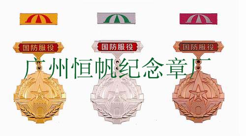 (從左至右分別為國防服役金質紀念章、國防服役銀質紀念章、國防服役銅質紀念章。)