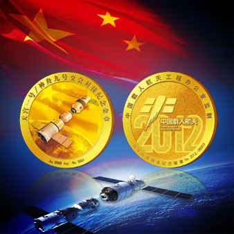 正面鐫刻有“天宮一號∕神舟九號交會對接紀念金章”字樣,以神舟九號飛船與天宮一號成功對接為主視覺畫面,背景為地球和飄揚的五星紅旗;背面鐫刻“中國載人航天工程辦公室監制”和“國家標準純金紀念徽章”字樣,“中國載人航天”標識躍然云紋設計“2012”之上,寓意2012年實現了中國載人航天又一壯舉。