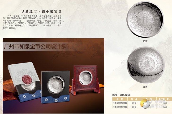 廣州市如泉金幣公司依托上海造幣廠和深圳國寶造幣廠等造幣公司以及金銀制品廠,設(shè)計定做紀(jì)念幣、紀(jì)念章、金銀幣、金銀章、金銀條,采用造幣工藝、選用千足金銀,個性定制金幣、定做銀幣、訂做金條、訂制銀條、制作紀(jì)念銀幣、制造紀(jì)念金幣、加工紀(jì)念銀章、生產(chǎn)紀(jì)念金章,純金純銀鑄造、全部國檢、權(quán)威檢測。