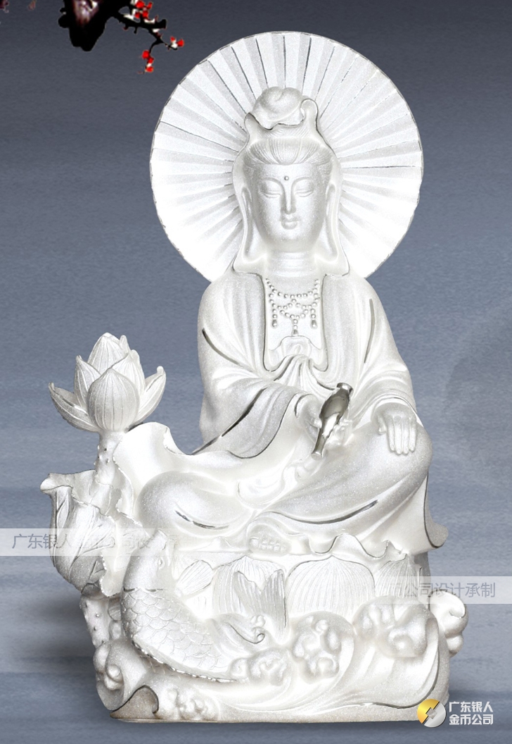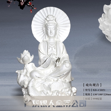 放生觀音純銀擺件、純銀戲魚放生觀音菩薩工藝擺件